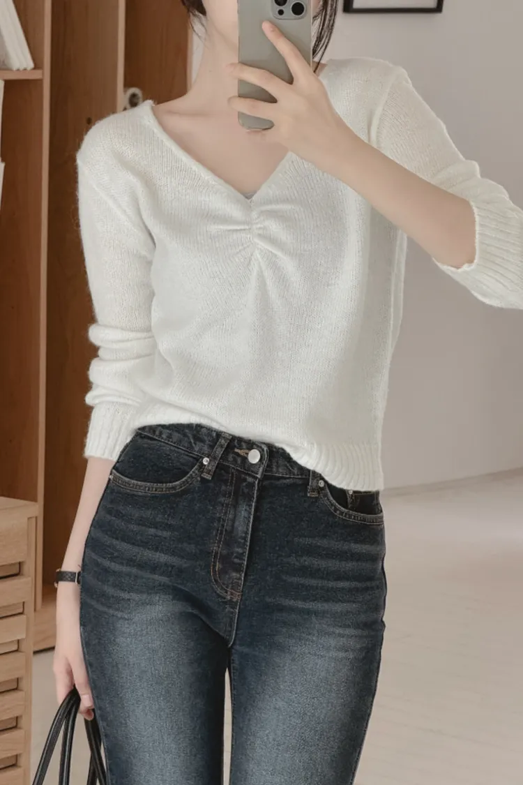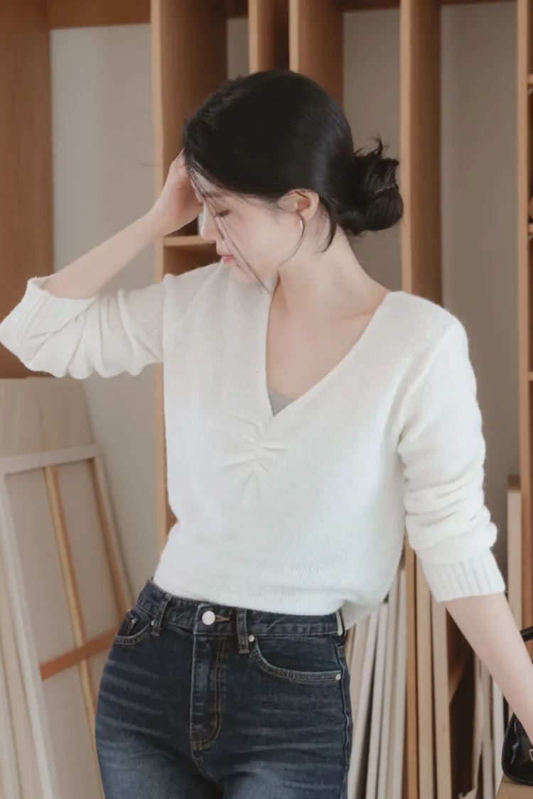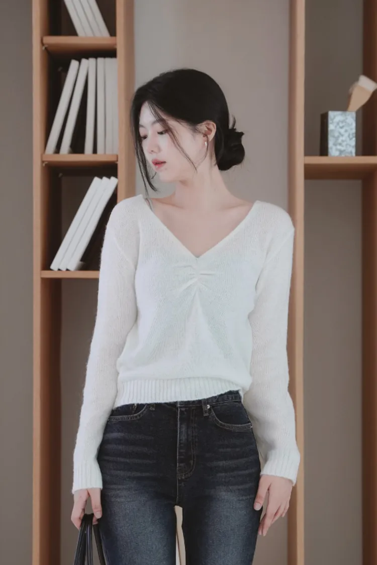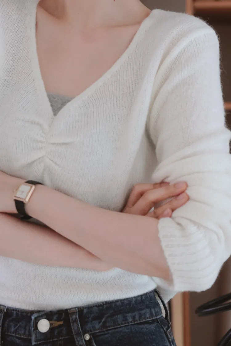 25-11H631抓皺設計V領馬海毛針織上衣