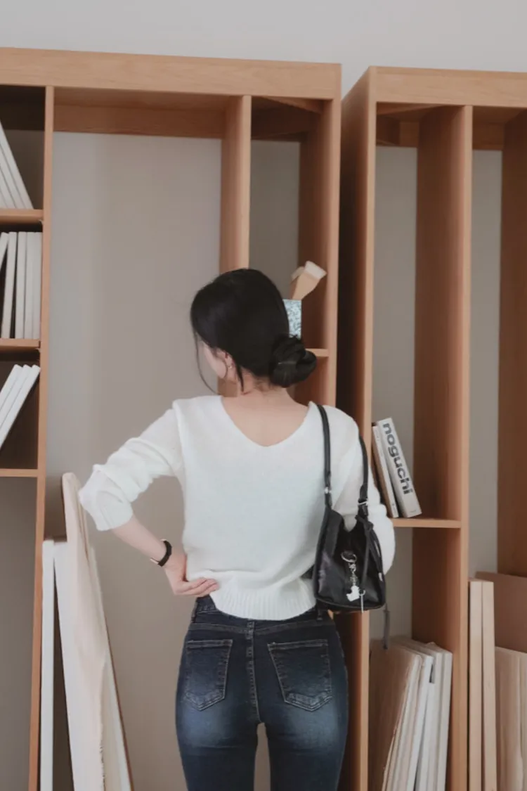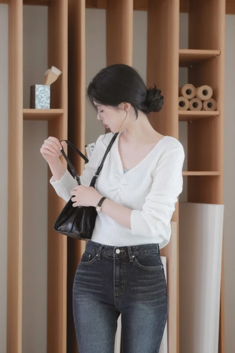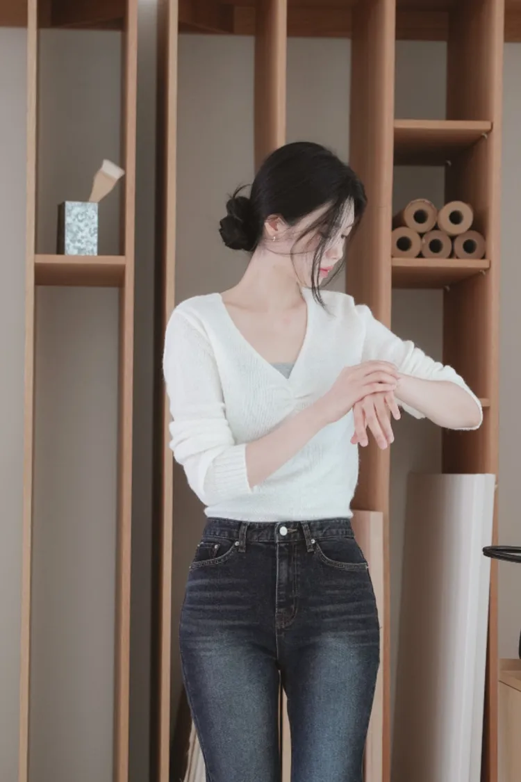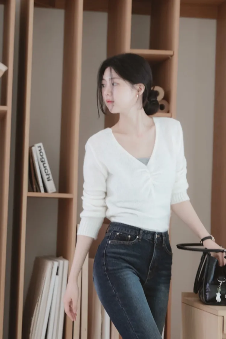 25-11H631抓皺設計V領馬海毛針織上衣
