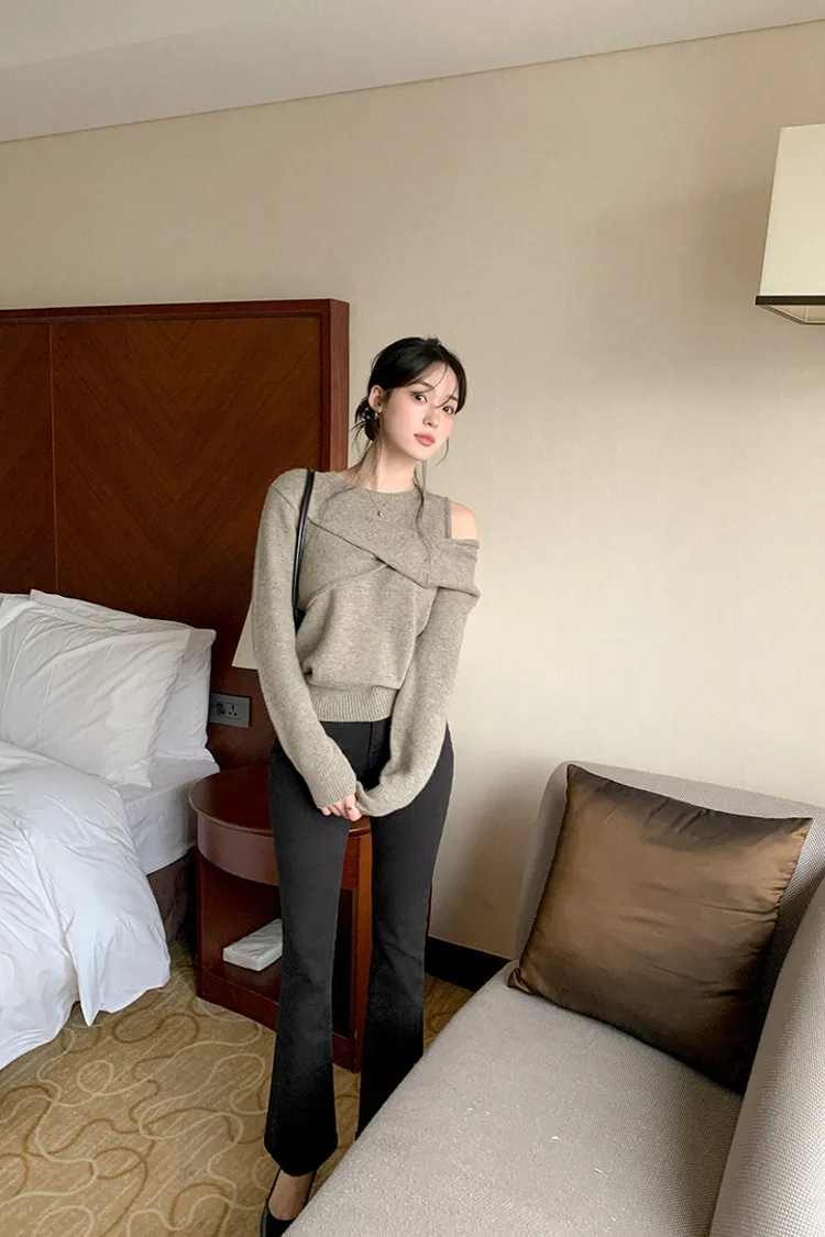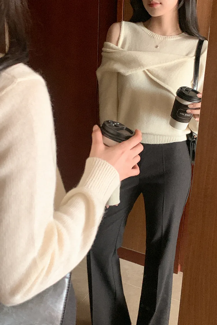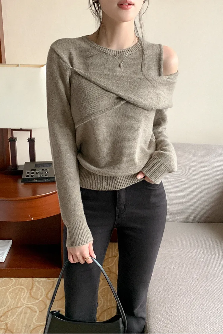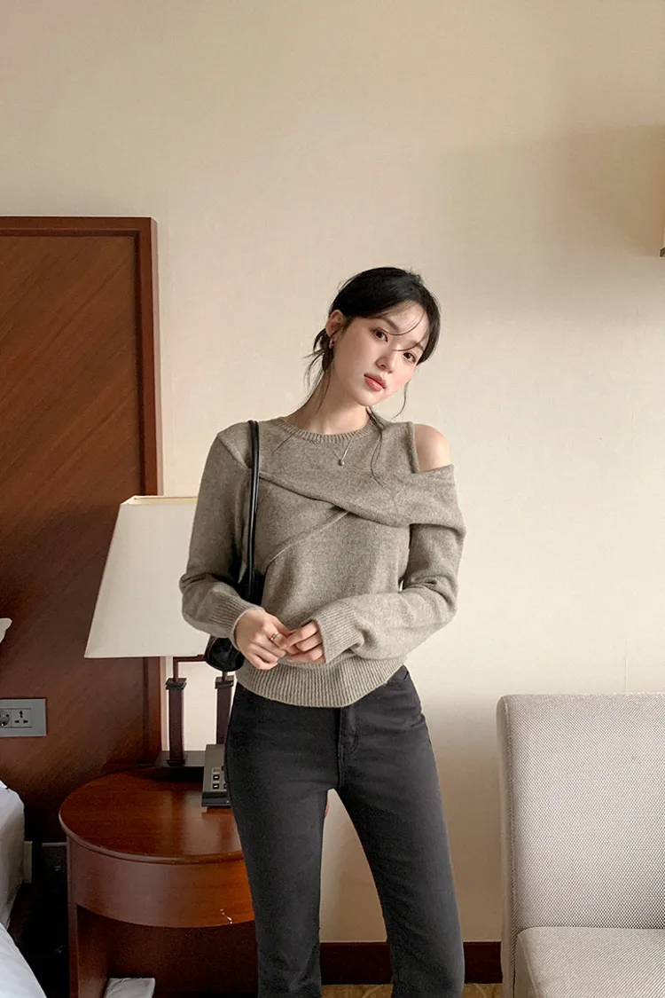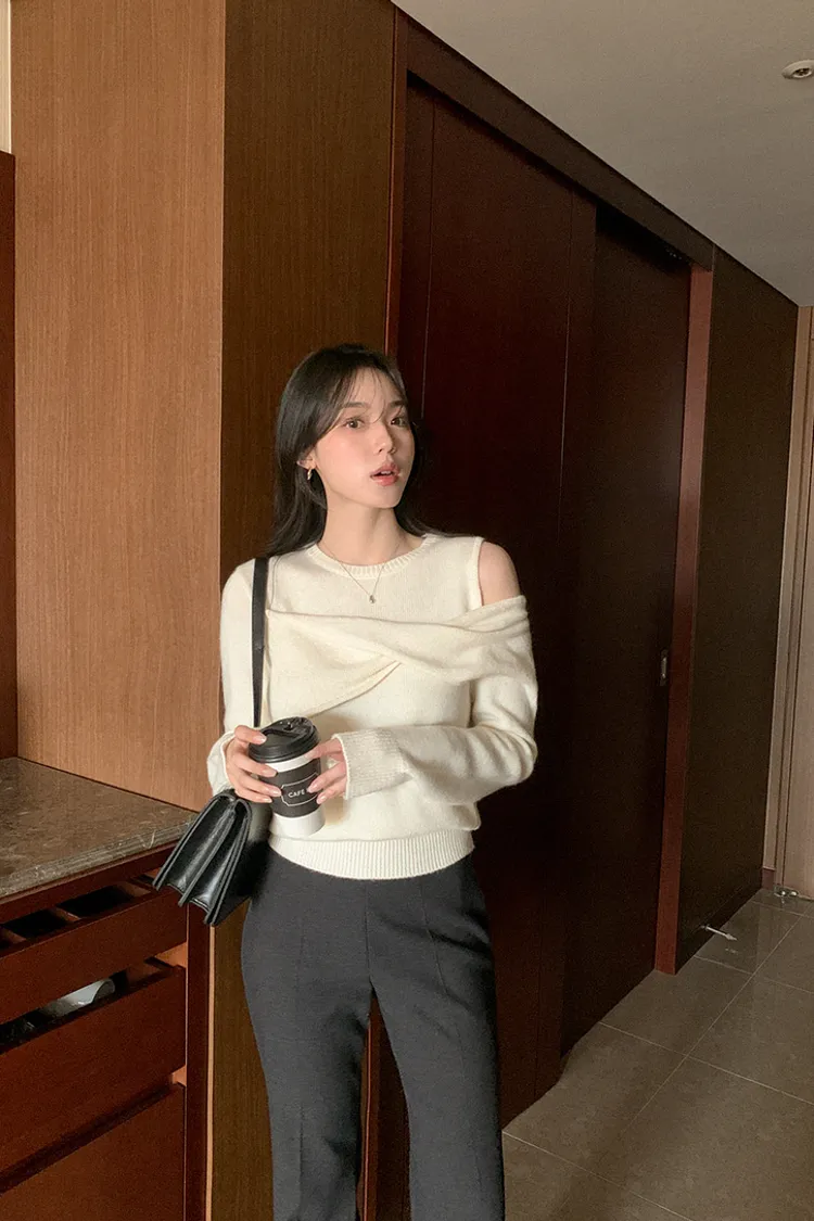 25-11H643cashmere扭結不對稱露肩針織上衣