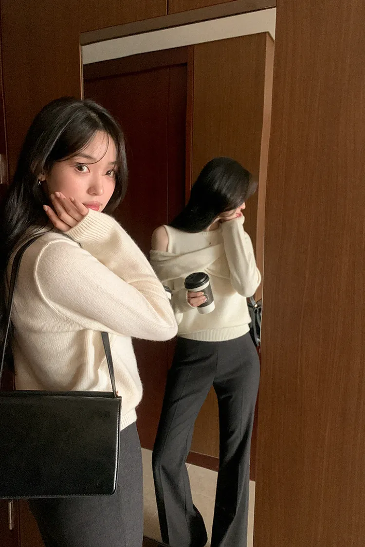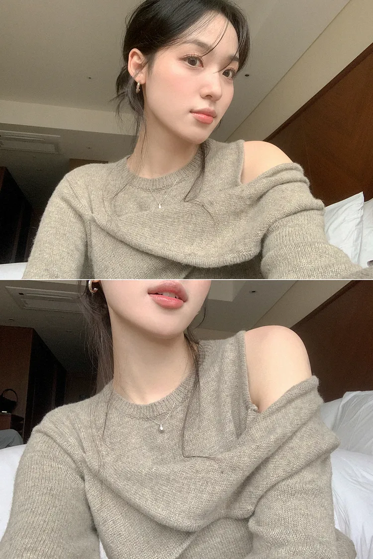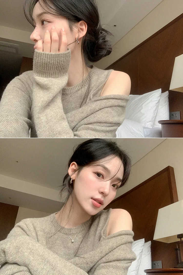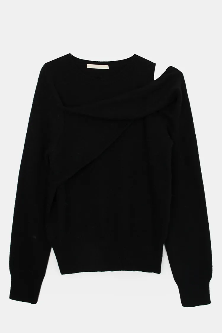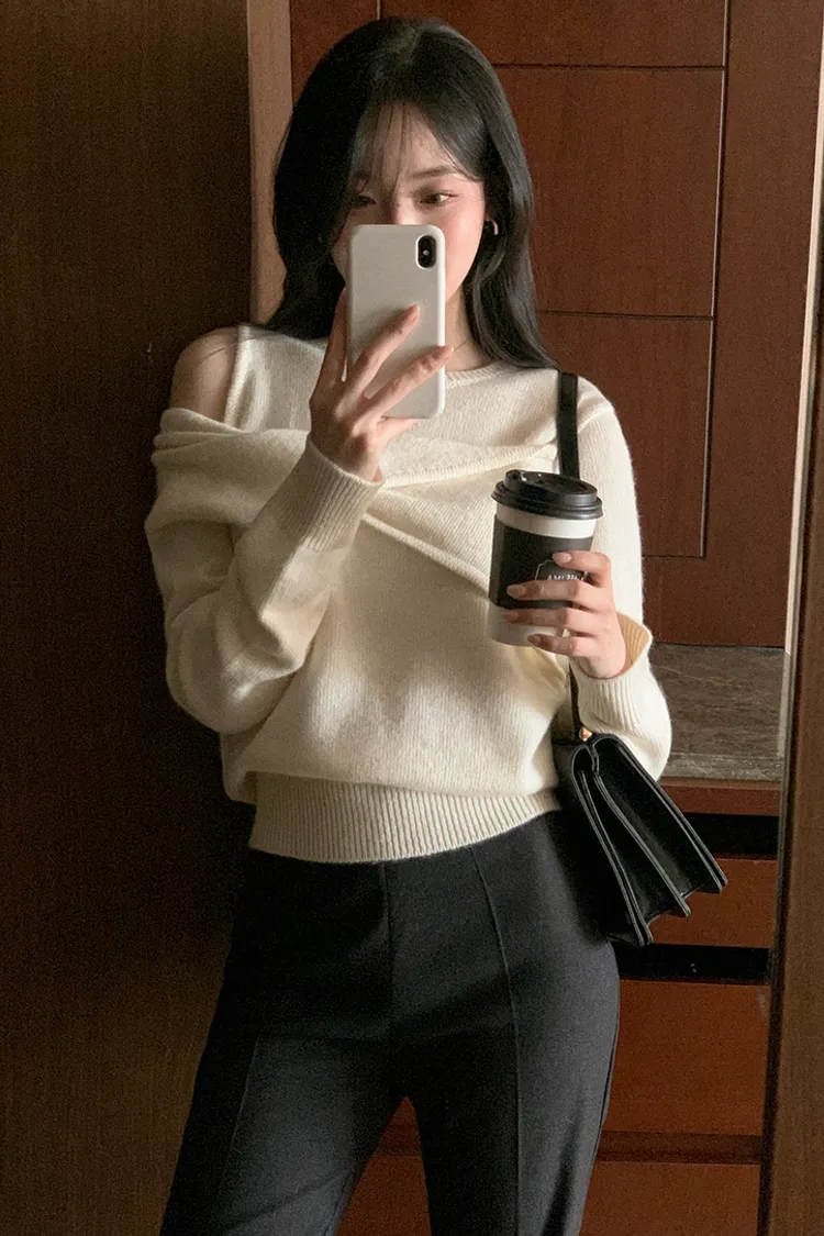 25-11H643cashmere扭結不對稱露肩針織上衣