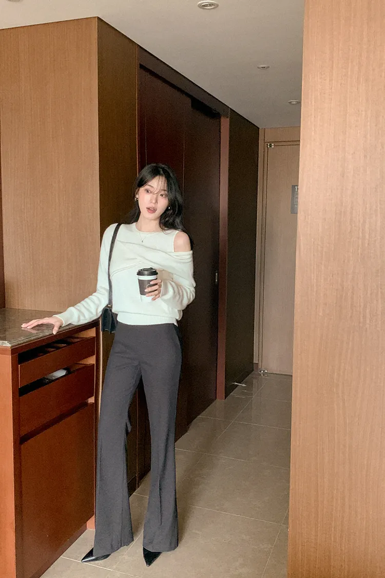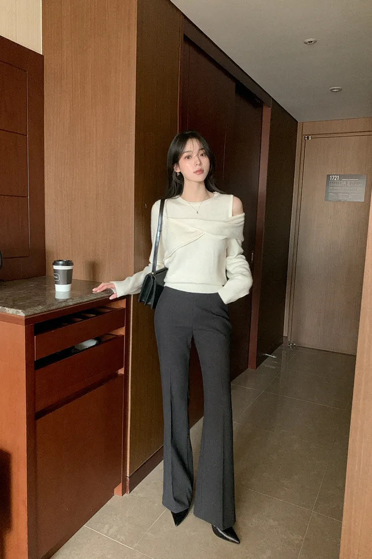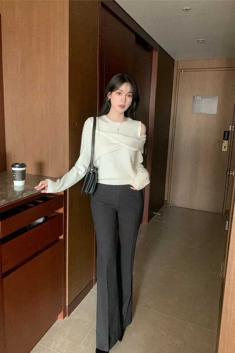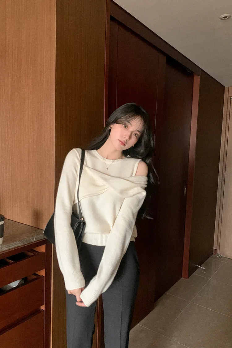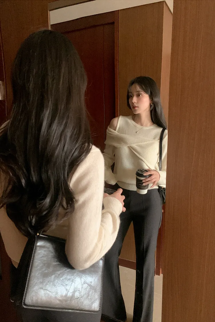25-11H643cashmere扭結不對稱露肩針織上衣