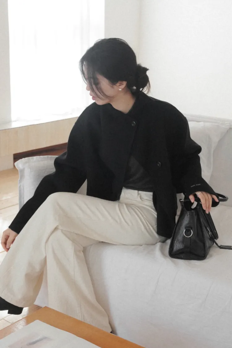 這款短版大衣採用輕盈的羊毛混紡布料製作