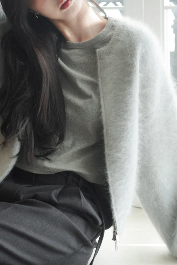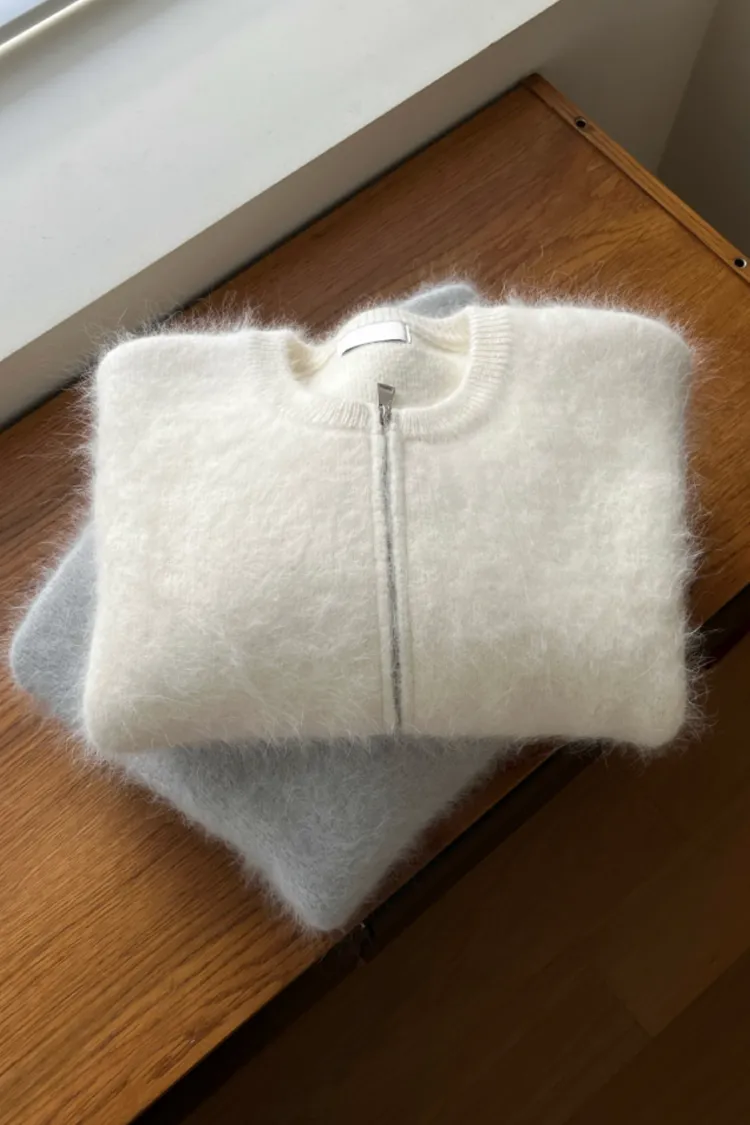 這款是以高比例安哥拉+羊毛混紡製成的針織拉鍊外套