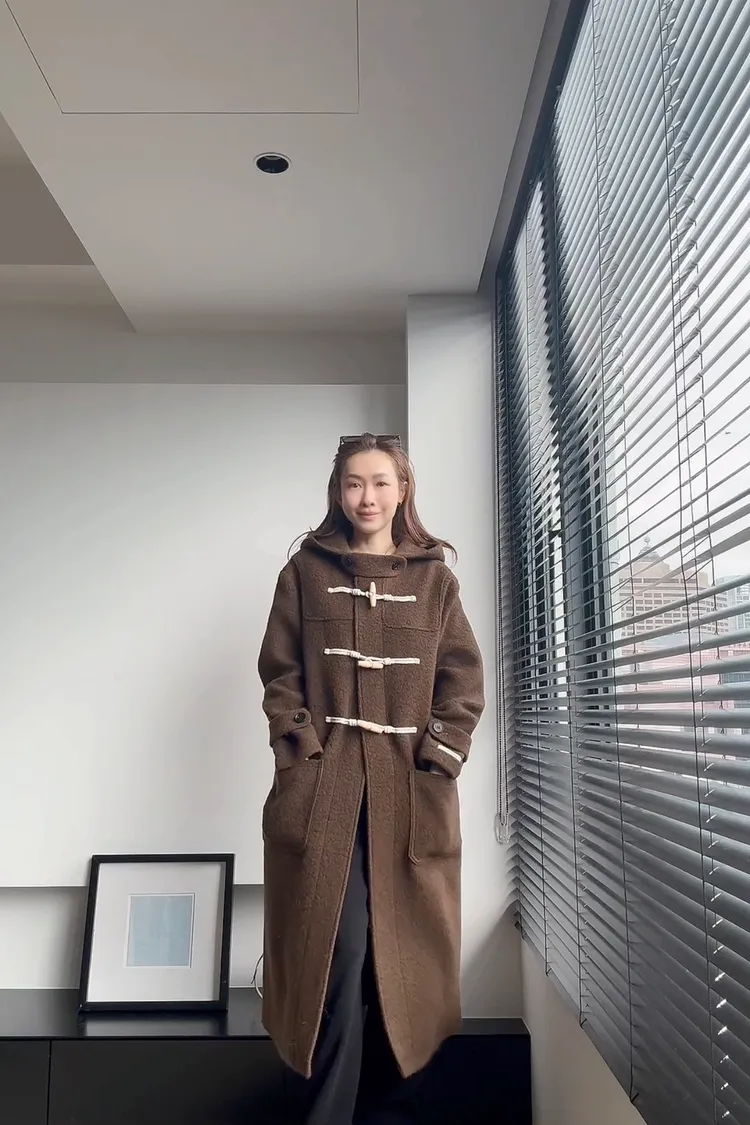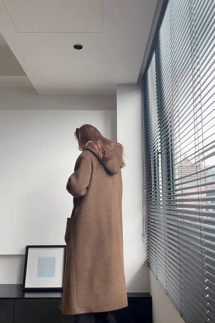 26-01K803特價款限量長版深咖羊毛連帽口袋牛角外套