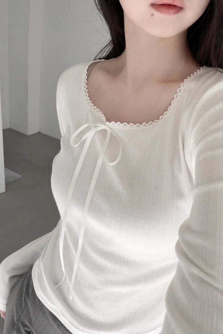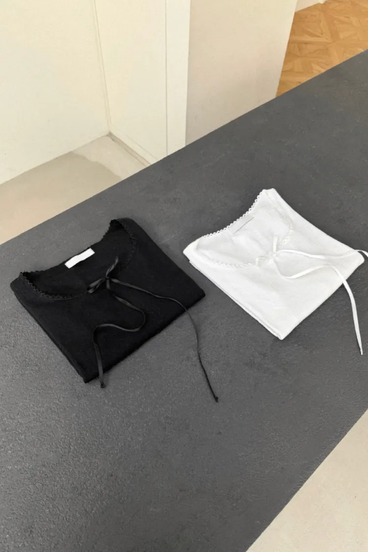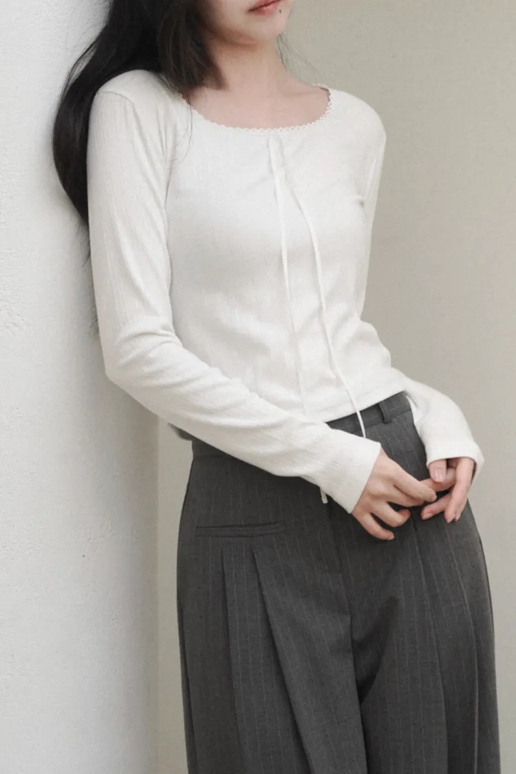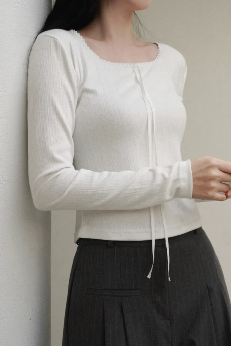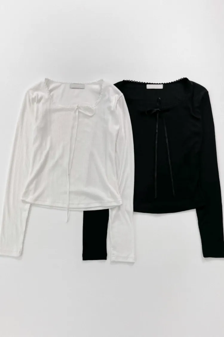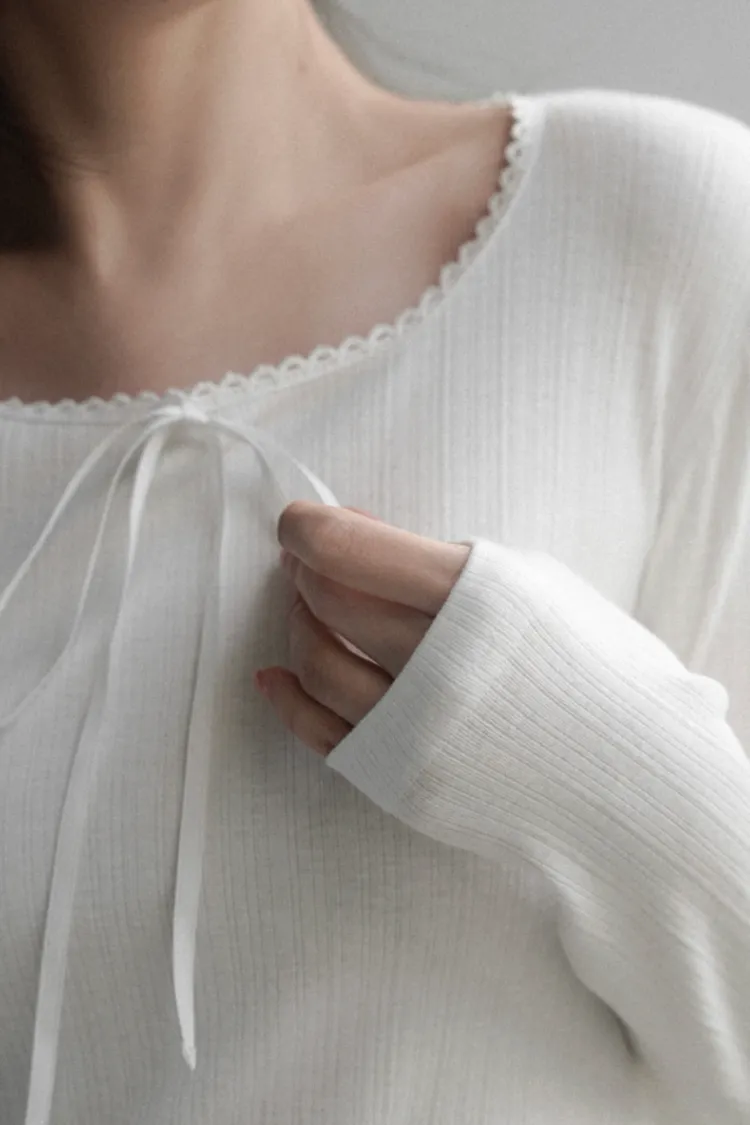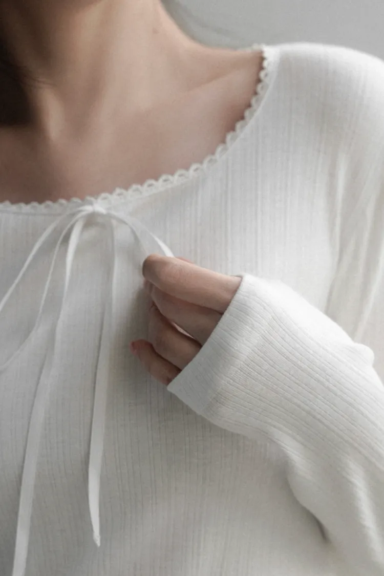26-02H201領口蕾絲滾邊綁帶長袖上衣