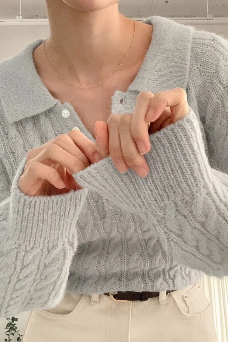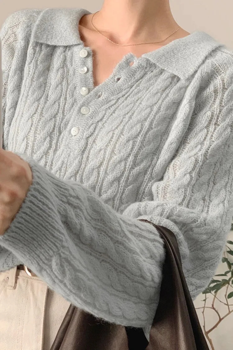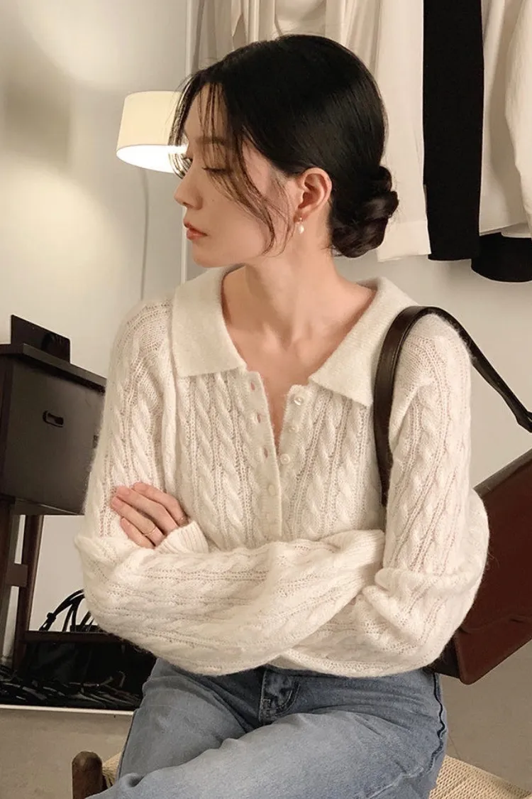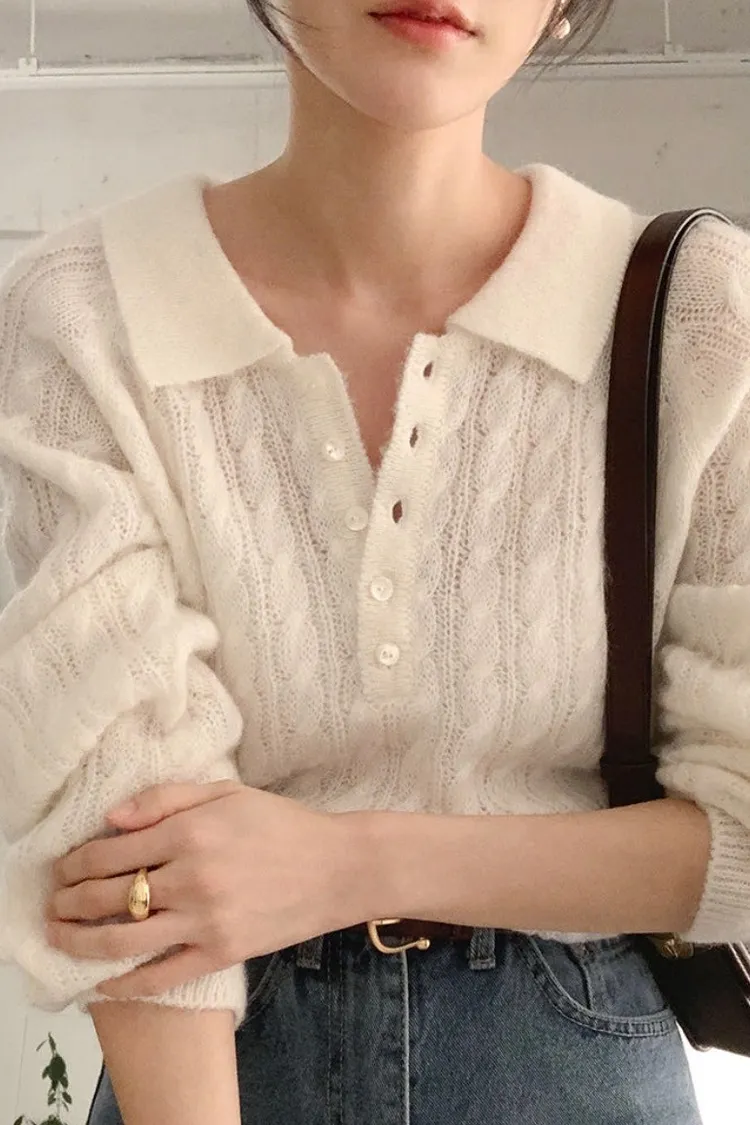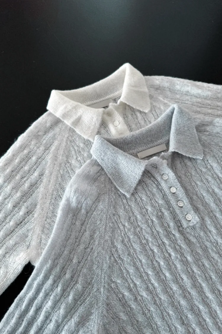 26-02H205微透膚感馬海毛麻花翻領針織上衣