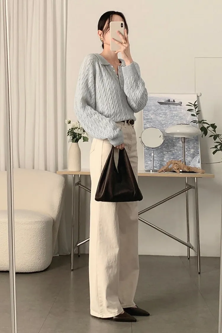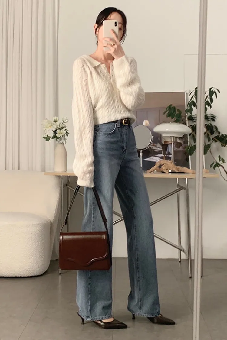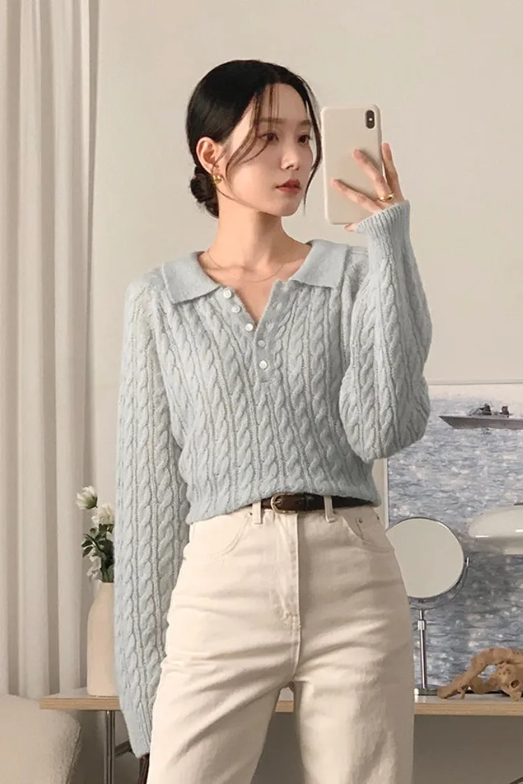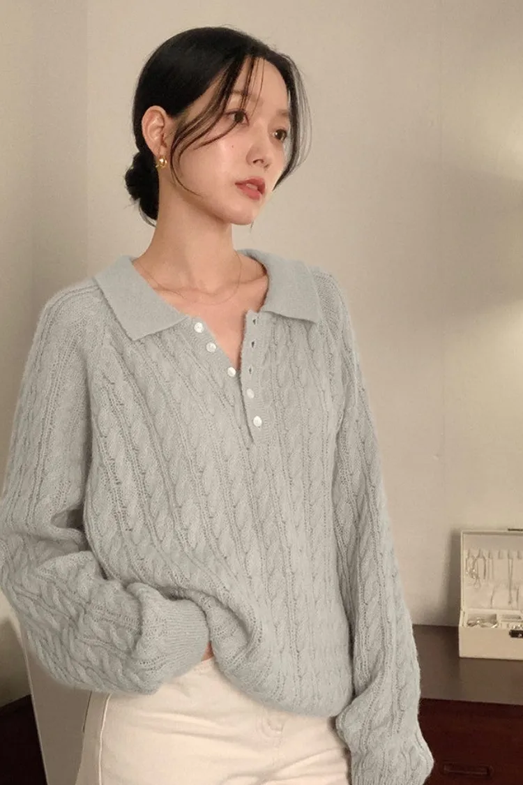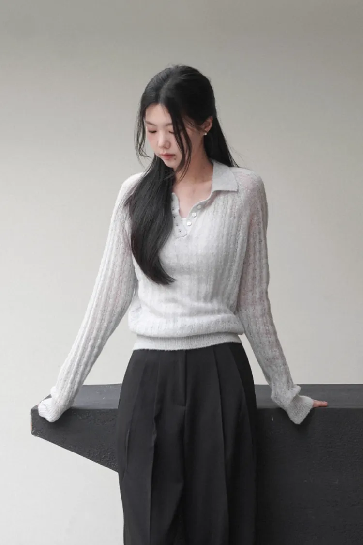 26-02H205微透膚感馬海毛麻花翻領針織上衣