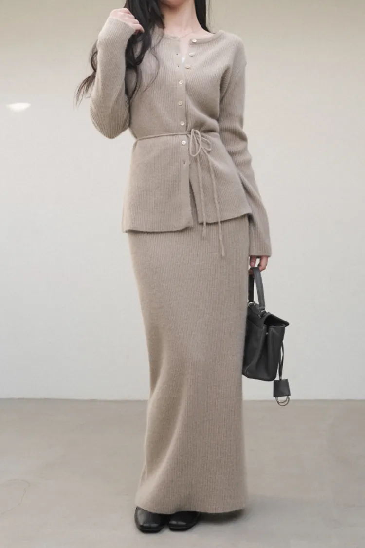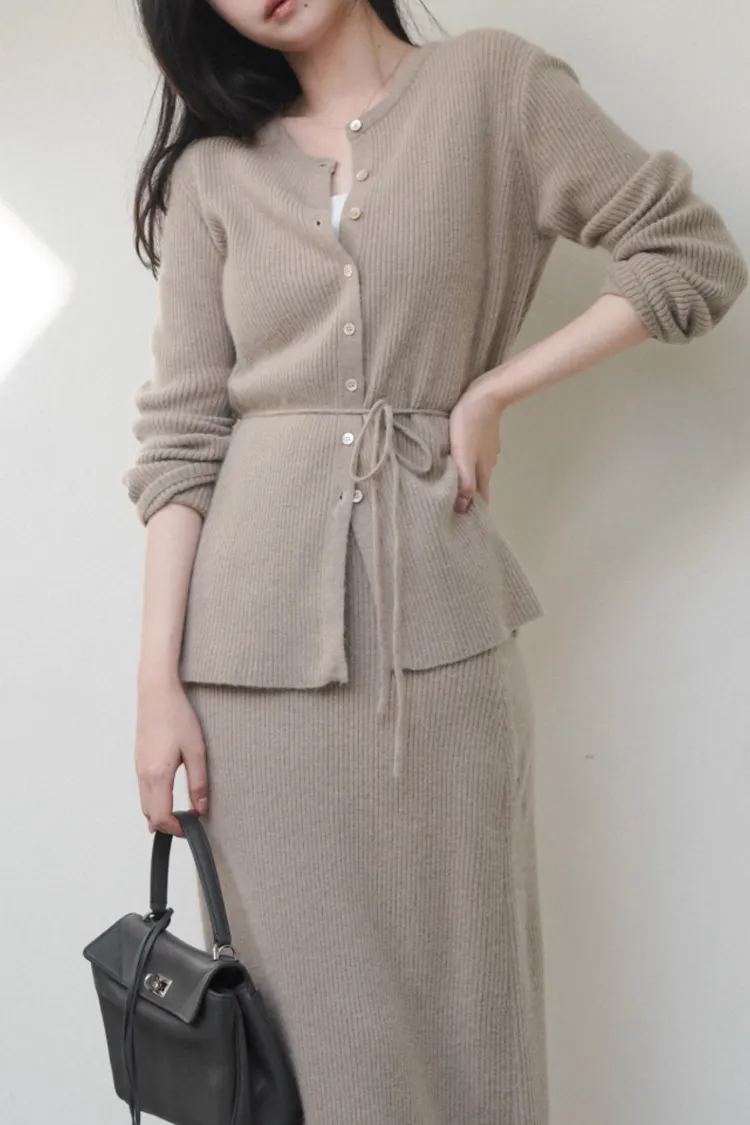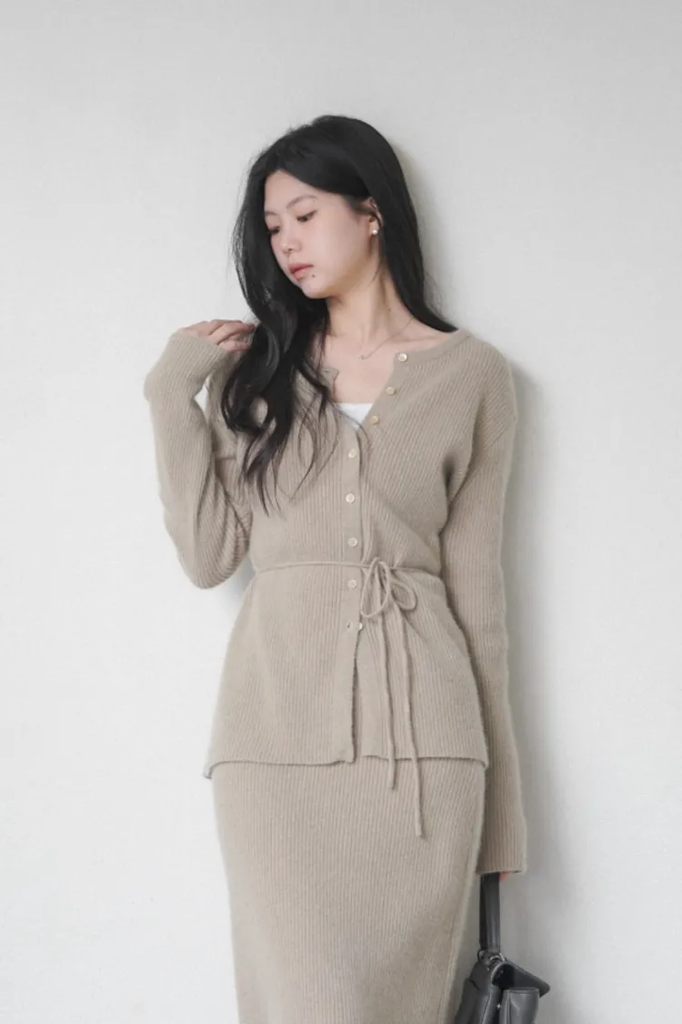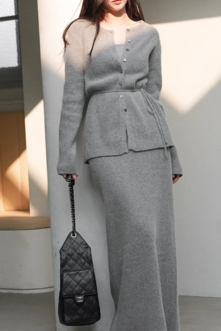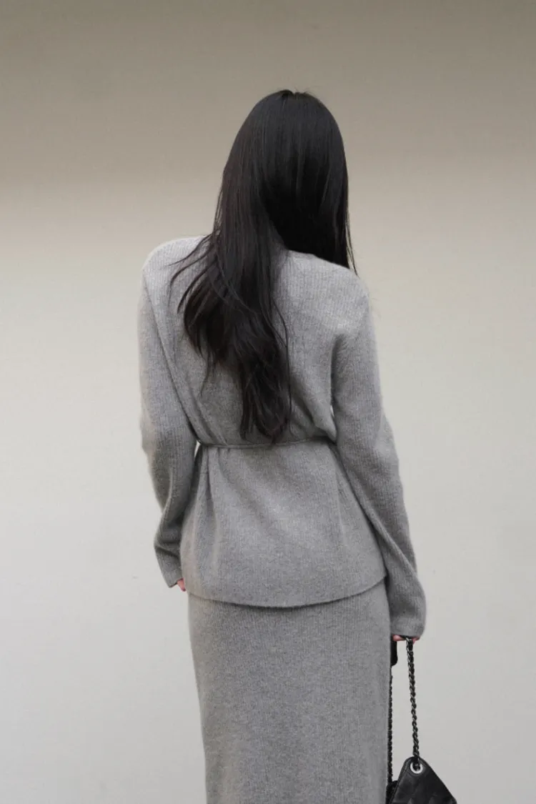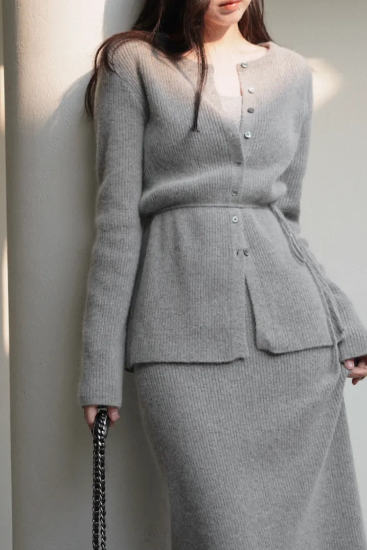 26-02H212高質感浣熊毛羅紋針織綁帶外套+長裙SET