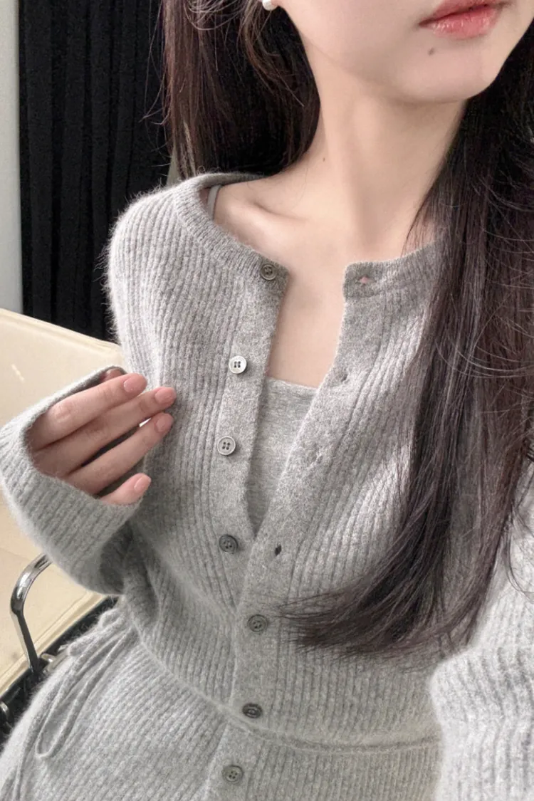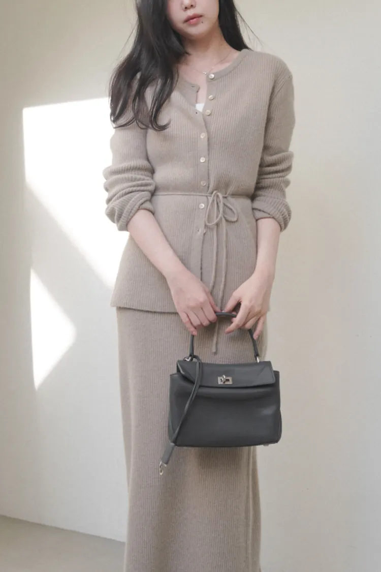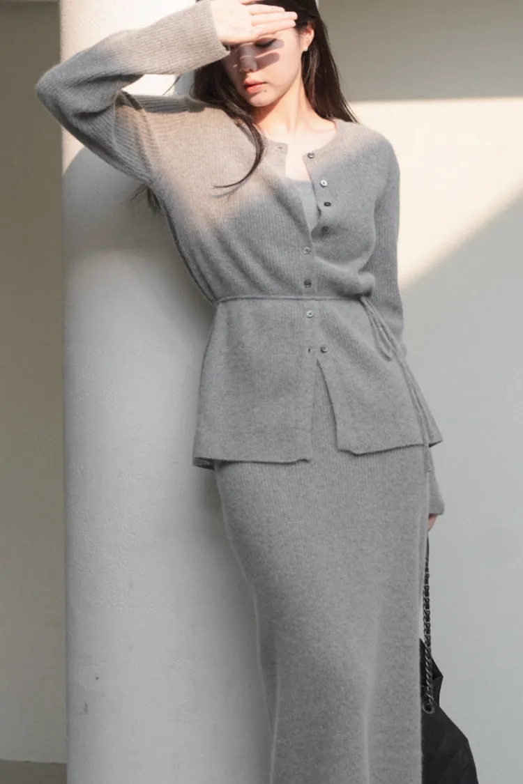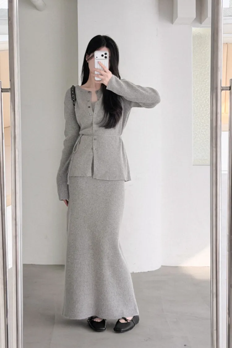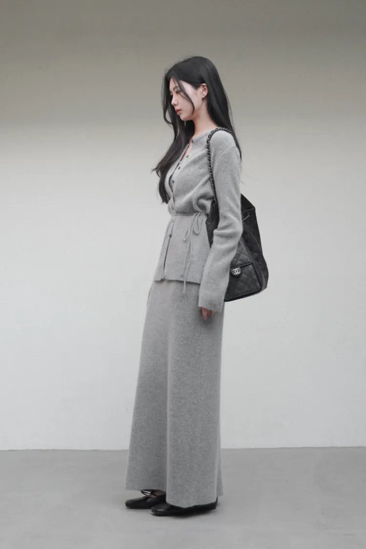 26-02H212高質感浣熊毛羅紋針織綁帶外套+長裙SET