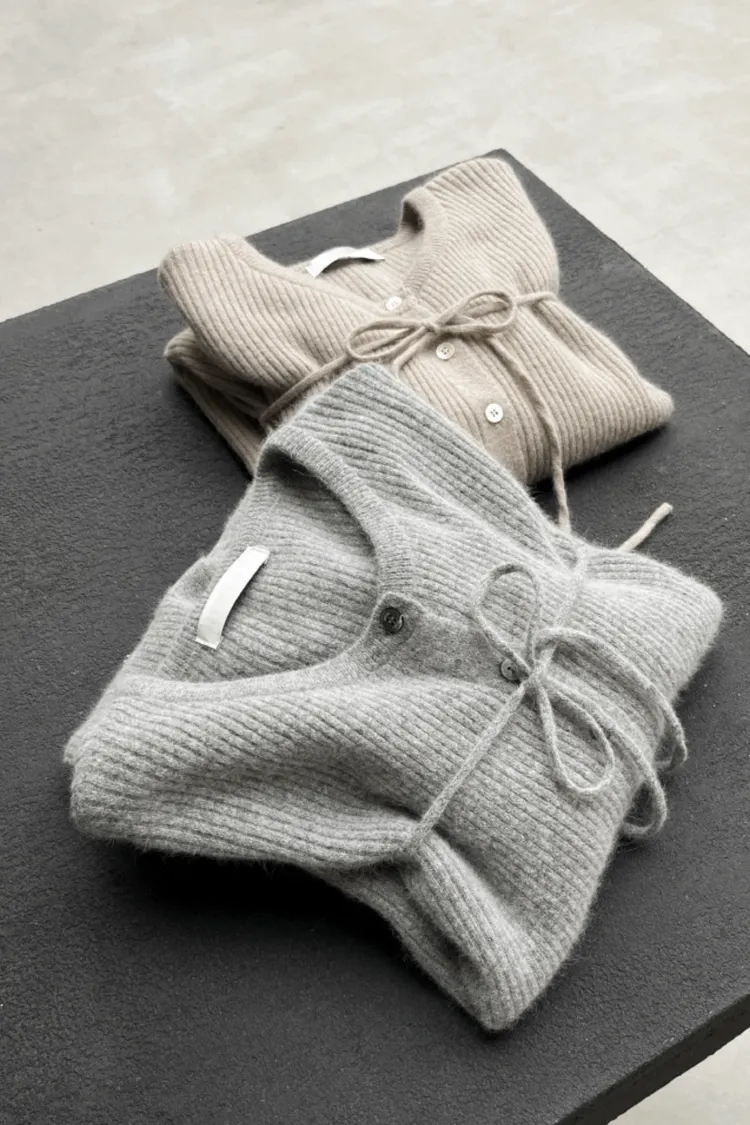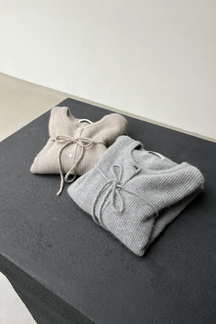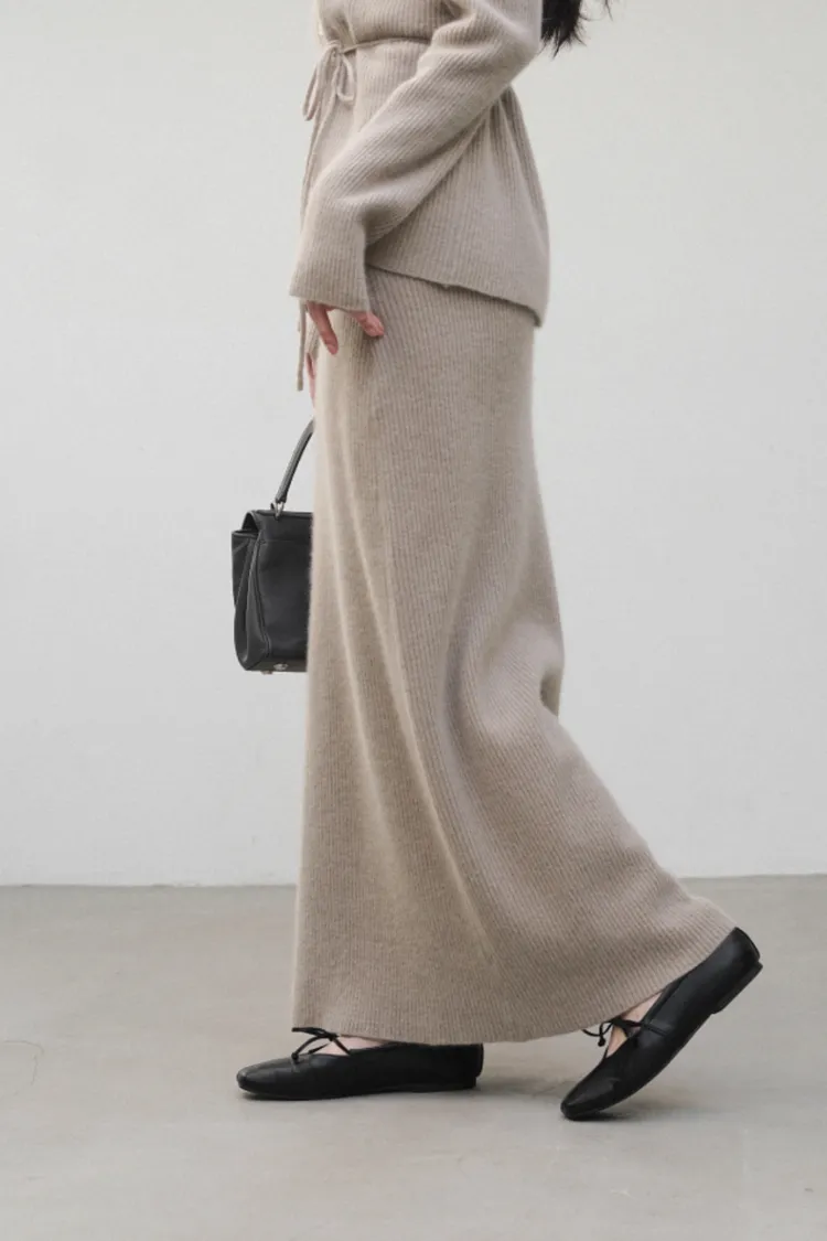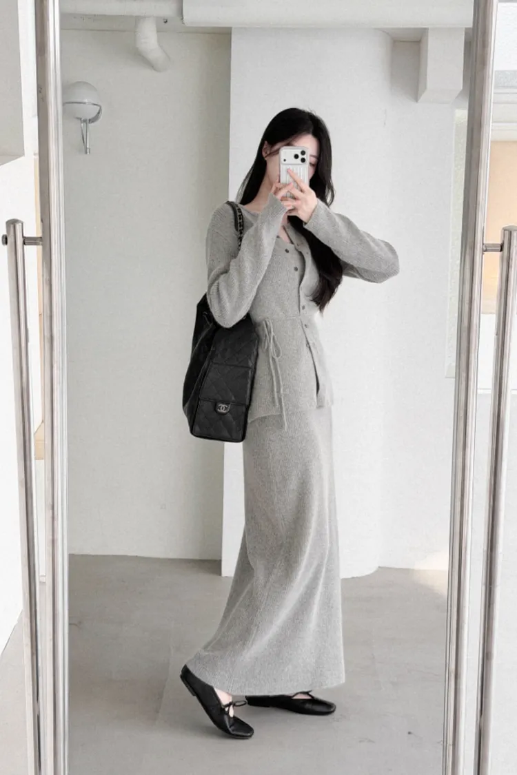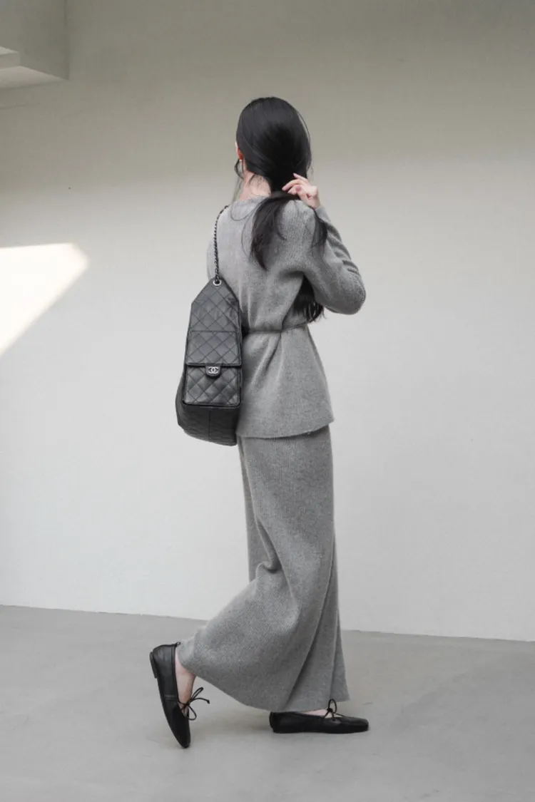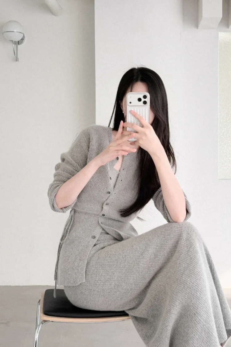 26-02H212高質感浣熊毛羅紋針織綁帶外套+長裙SET