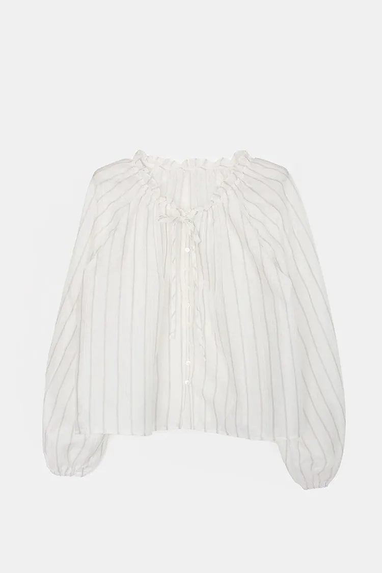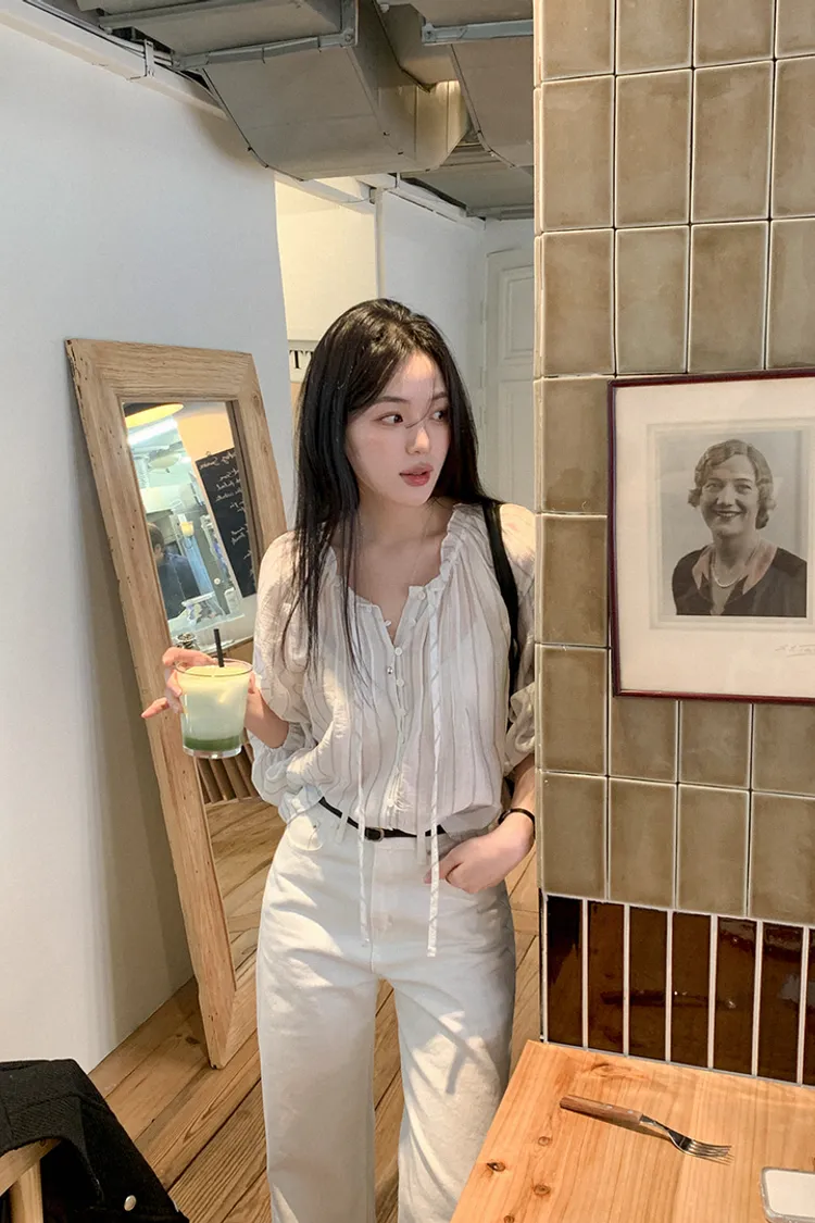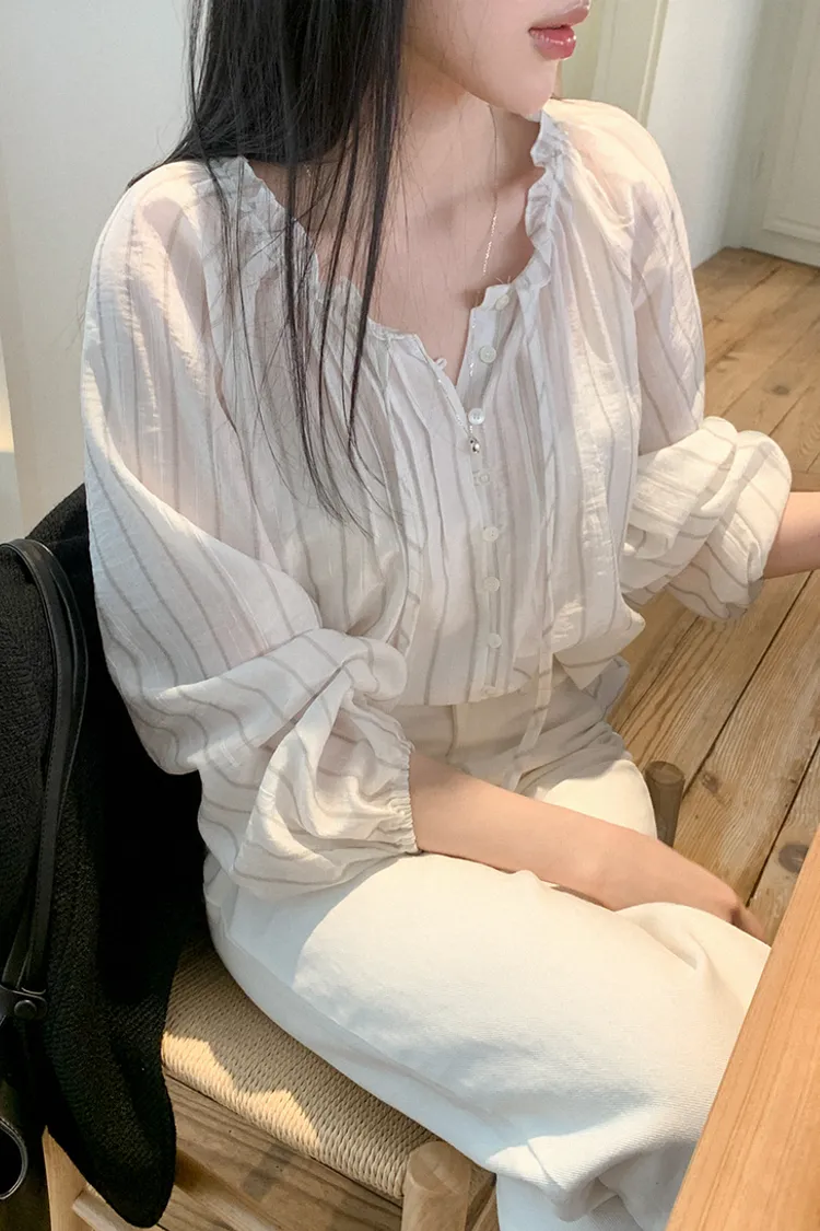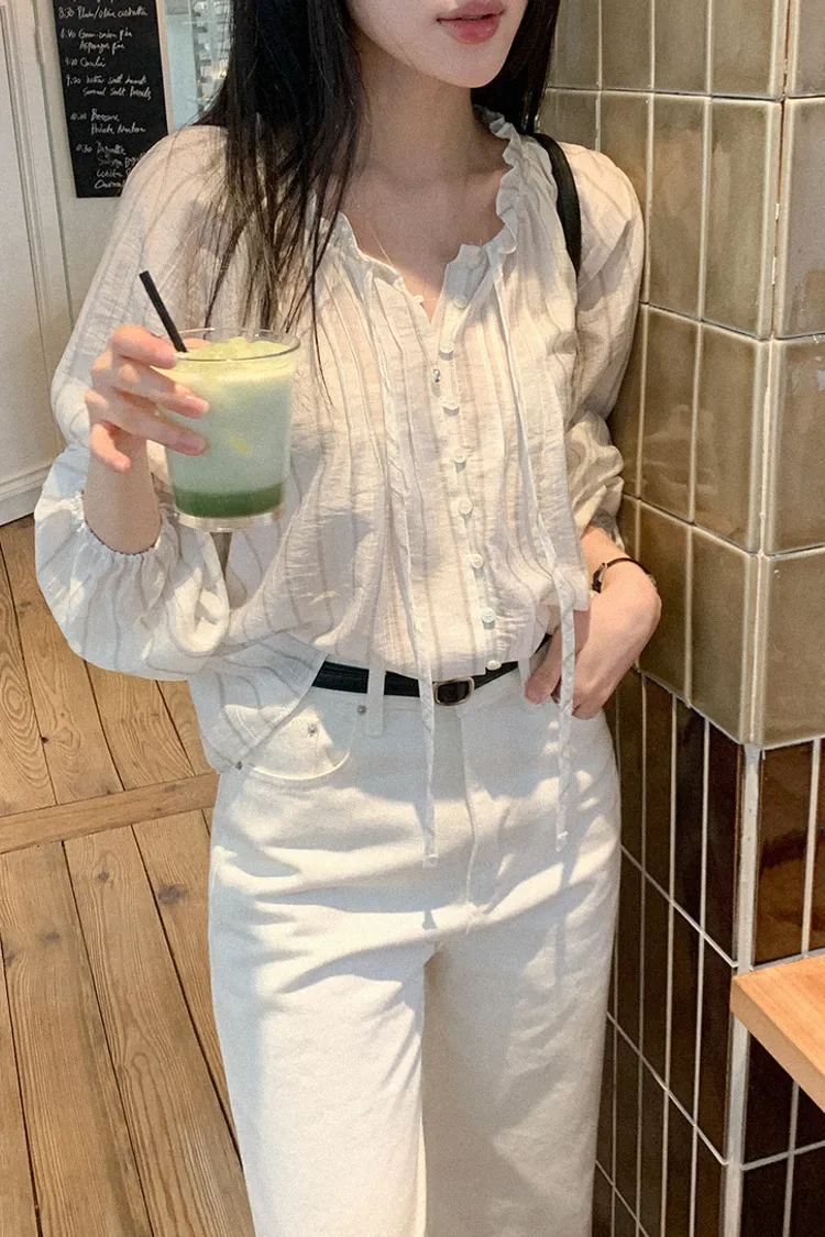 26-03H304氣質天絲直紋荷葉滾邊綁帶上衣