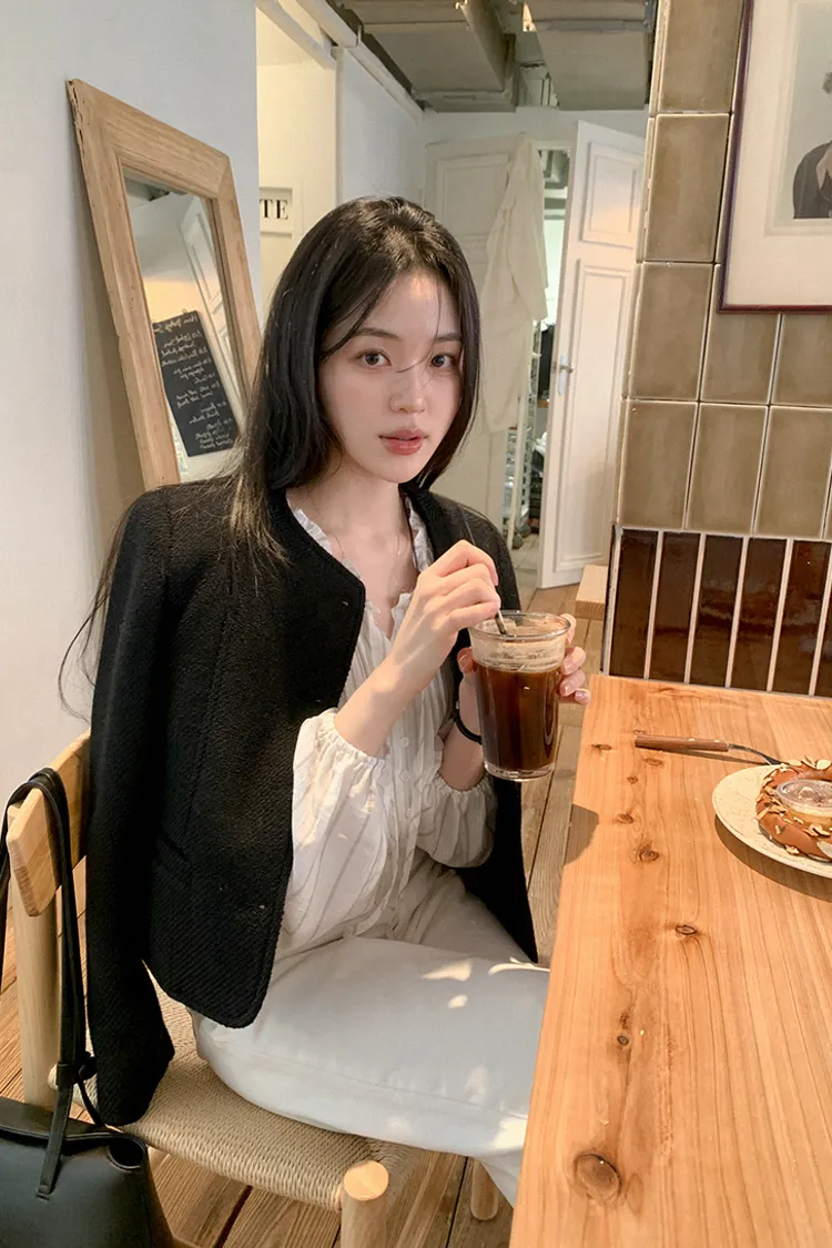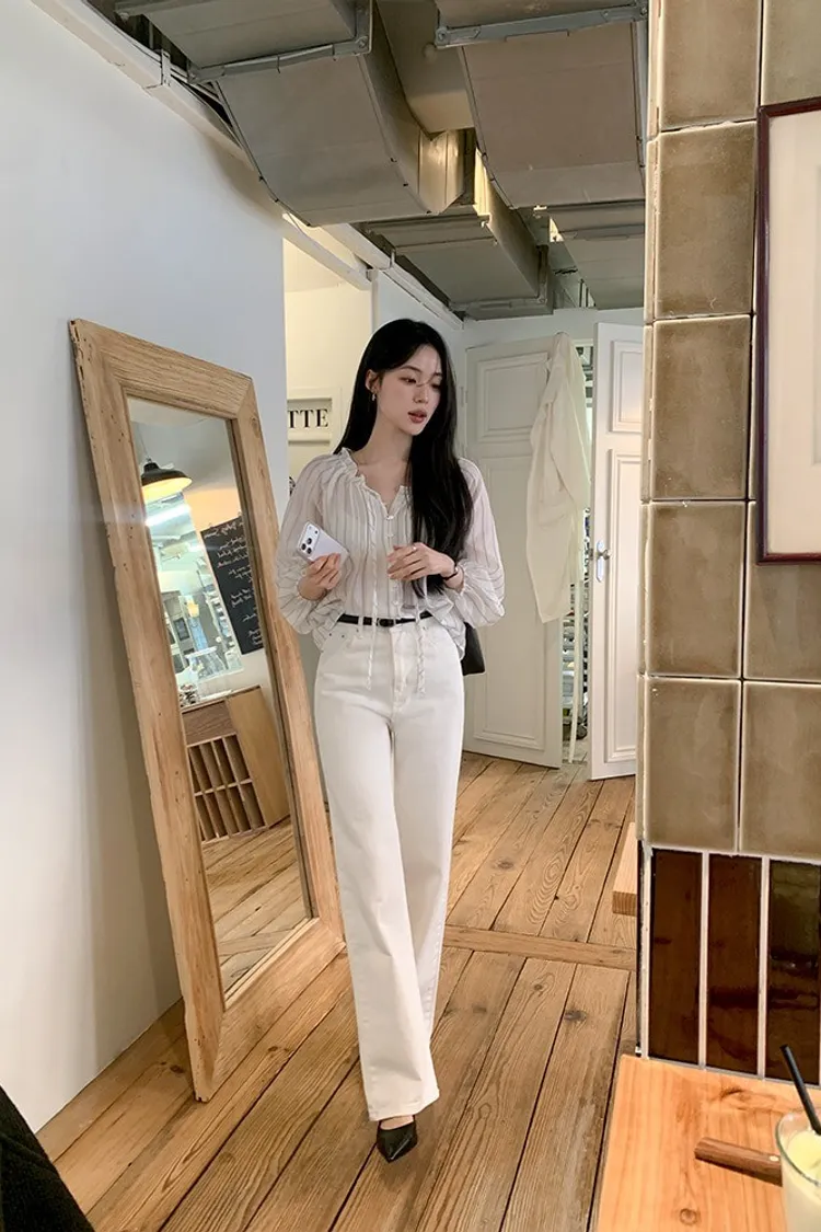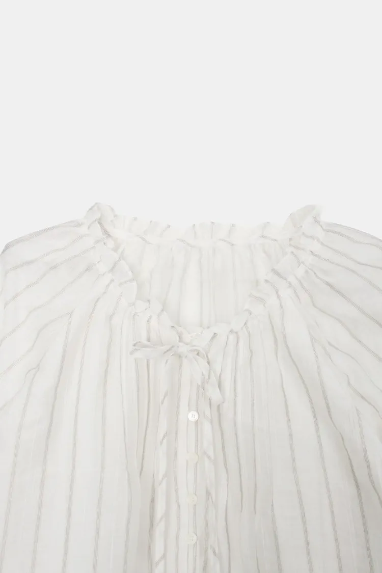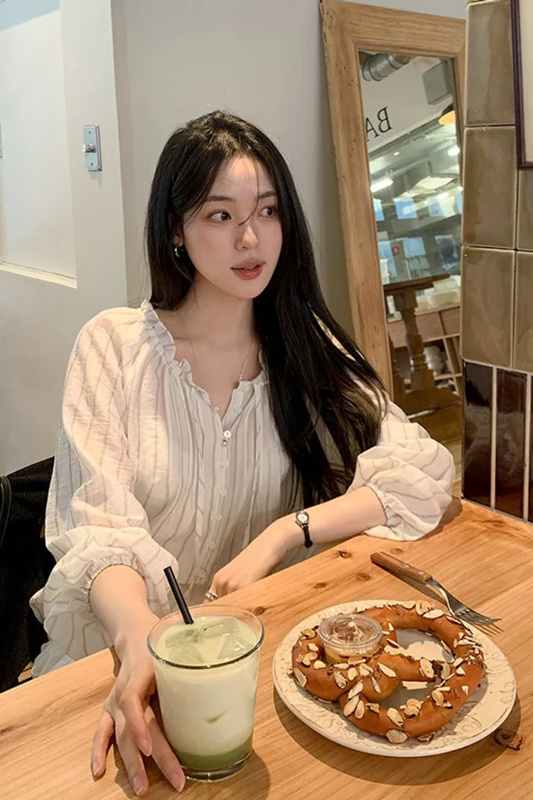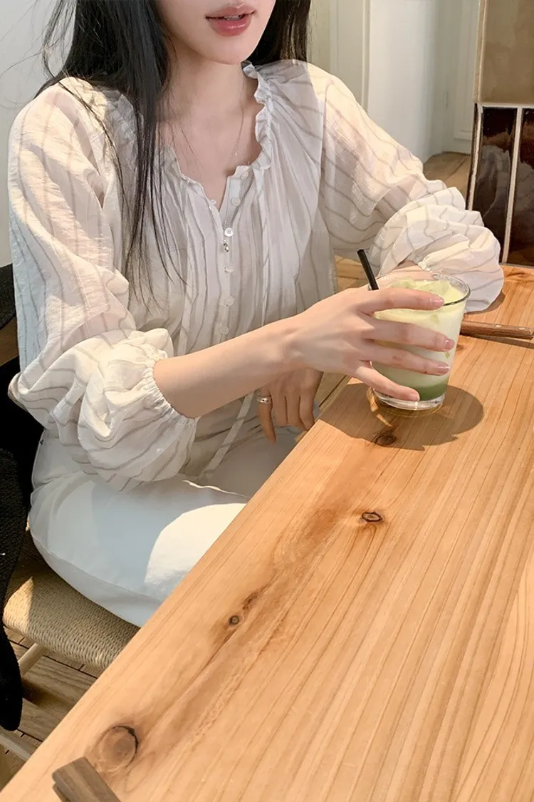26-03H304氣質天絲直紋荷葉滾邊綁帶上衣